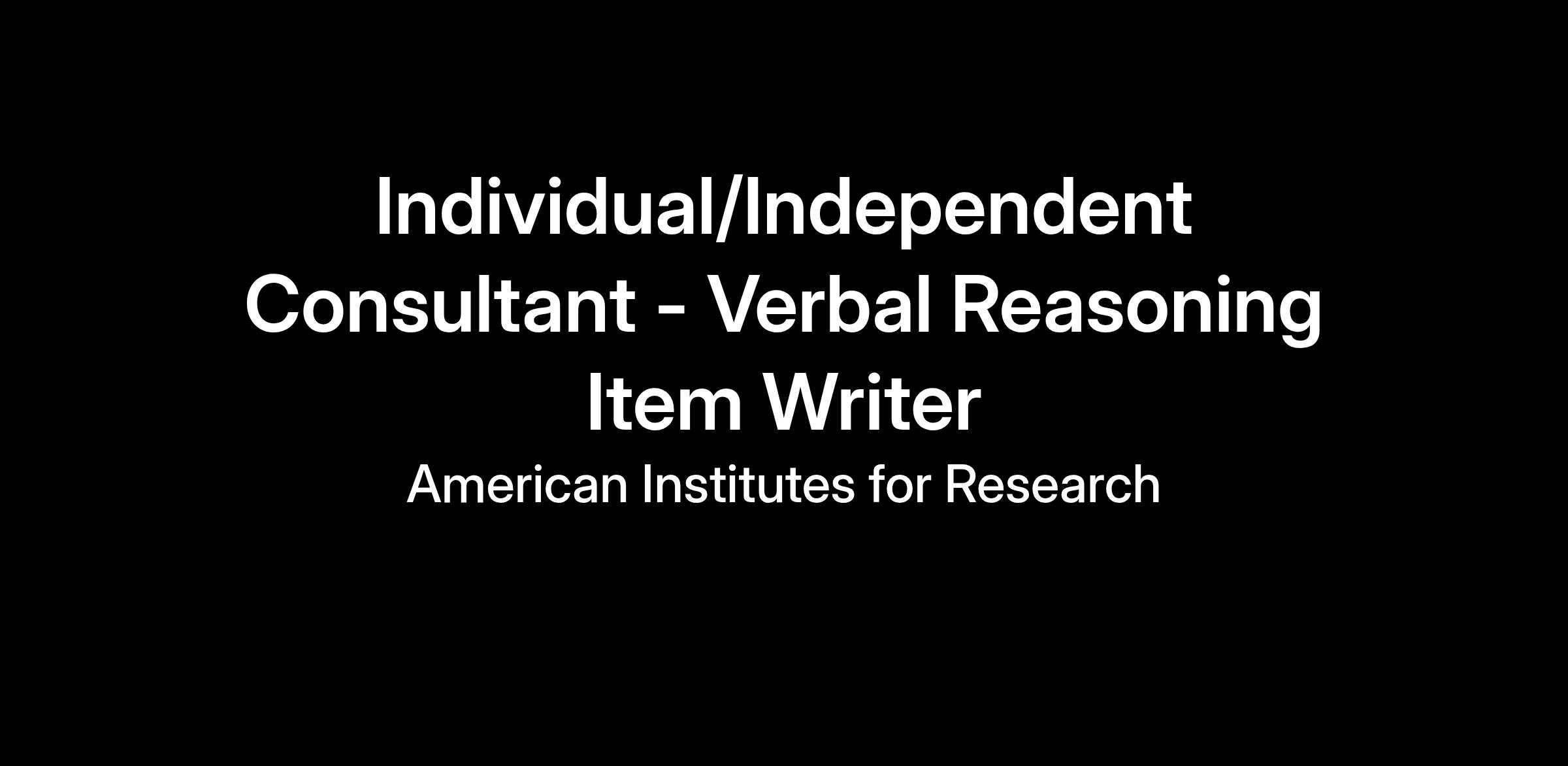 The American Institutes for Research (AIR) is seeking a highly skilled Verbal Reasoning Item Writer to support test content development for the Medical College Admission Test (MCAT), a high-stakes, nationally administered assessment. The Verbal Reasoning Item Writer will support the item writing process. Item writing involves developing reading passages with multiple-choice questions intended to assess the critical reasoning skills of test takers. The ideal independent consultant has teaching experience at an introductory level with undergraduate populations, with a preference for more experience. AIR will contract directly with the Independent Consultant under a consulting purchase order agreement.