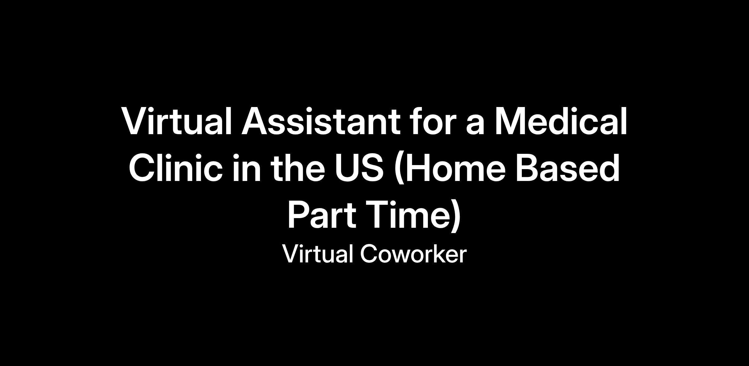 https:\/\/www.linkedin.com\/company\/virtual\-coworker"}],"isMobile":false,"iframe":"true","jobType":"Part time","applyName":"Apply Now!","zsoid":"8208015","FontFamily":"Arial, Helvetica, sans\-serif","jobOtherDetails":[{"fieldLabel":"Work Schedule","uitype":1,"value":"8:00AM\-12:00PM Eastern Standard Time ( EST)"},{"fieldLabel":"Hours Per Day","uitype":2,"value":"Part Time â 4 hours per day"},{"fieldLabel":"Industry","uitype":2,"value":"Health Care Industry"},{"fieldLabel":"Client Location","uitype":2,"value":"USA"},{"fieldLabel":"Work Location","uitype":1,"value":"Home Based \- Philippines"},{"fieldLabel":"City","uitype":1,"value":"Dublin"},{"fieldLabel":"State\/Province","uitype":1,"value":"Ohio"},{"fieldLabel":"Zip\/Postal Code","uitype":1,"value":"43017"}],"headerName":"Virtual Assistant for a Medical Clinic in the US (Home Based Part Time)","widgetId":"147741000000390320","isJobBoard":"false","userId":"147741000000027001","attachArr":[],"customTemplate":"3","isCandidateLoginEnabled":true,"jobId":"147741000070152149","FontSize":"12","location":"Dublin","embedsource":"CareerSite","logoId":"idwop0ece2fcac21a443ba16938fb832bdc3b"}